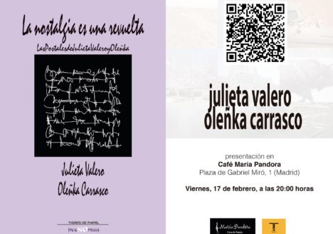 Après un an dans le cyberespace, le projet de collaboration avec la poète Julieta Valero appelé Las Postales de Julieta Valero y Oleñka se transforme en un beau livre, le deuxième titre de la Collection PoeNOmas de la maison madrilène d’édition Tigres de Papel La présentation du livre se fera à Madrid, dans le mythique Café María Pandora #SavetheDate…